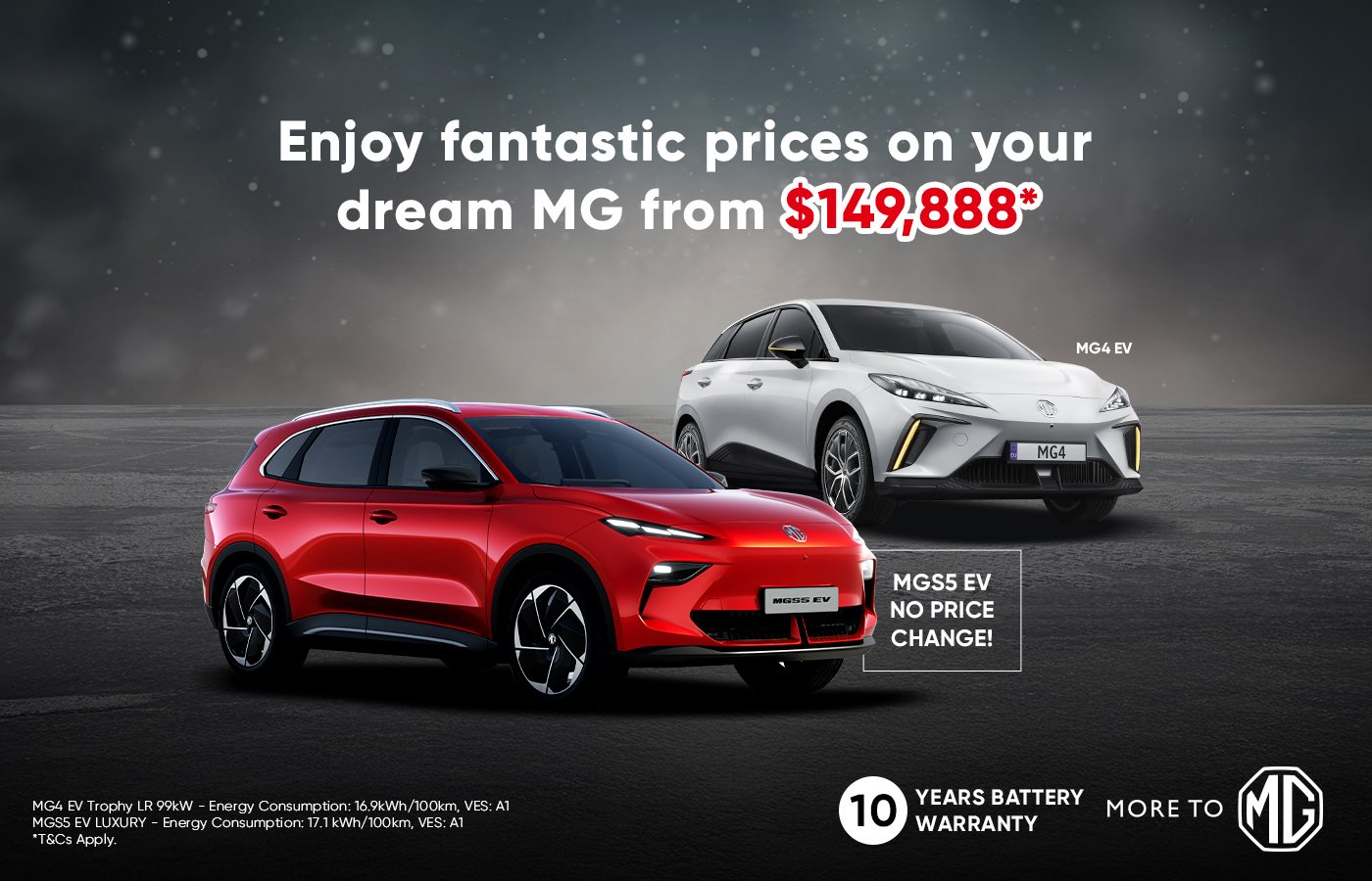 Drive home the perfect gift for yourself this holiday season with fantastic prices starting from just $149,888* on the MG4 EV hatchback, and NO PRICE CHANGE on the MGS5 EV SUV!